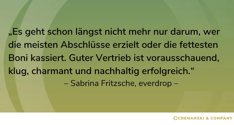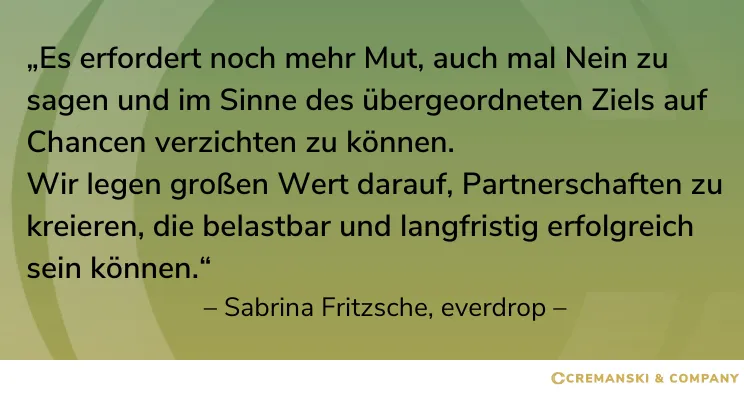 Sabrina Fritzsche, Head of Sales, everdrop Sabrina Fritzsche leitet seit April 2021 den Vertrieb des Münchner StartUps everdrop. Damit vereint sie ihre berufliche Passion mit einem ganz persönlichen Anliegen: Einen Beitrag zu einer besseren Welt zu leisten. Zuvor unterstützte die Diplom-Kommunikationswirtin in mehr als zehn Jahren verschiedene Unternehmungen bei dem Auf- und Ausbau von High-Performance-Vertriebsstrukturen im On- und Offline-Bereich. Zuletzt als Head of Online-Sales der 1&1 Drillisch AG.