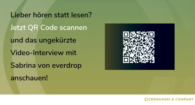 Sehr gerne. Mein Name ist Sabrina und ich leite seit einem Jahr den Vertrieb bei und für everdrop. Was ich daran liebe? In meinem Job bringe ich 3 Aspekte zusammen: Ich begeistere Menschen für eine Mission, für die ich persönlich brenne und helfe ihnen dabei, gute nachhaltige Entscheidungen zu treffen und erziele damit eine tolle Performance. everdrop wurde 2019 von unseren beiden Foundern Chris und David gegründet mit dem Ziel, die Welt zu entplastifizieren.